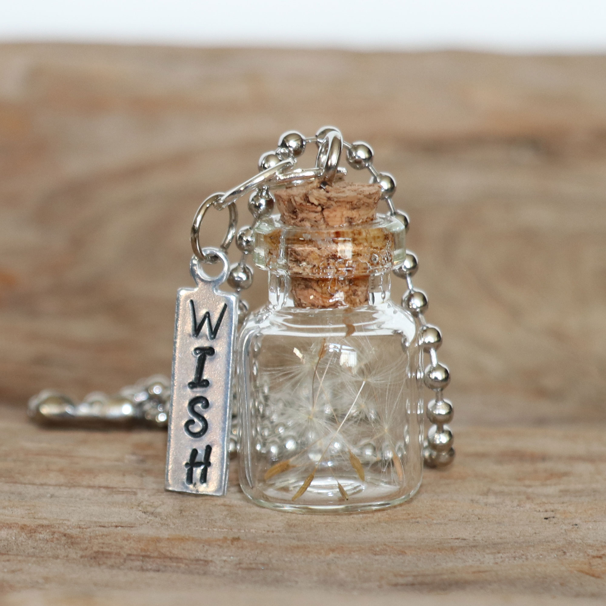 Dandelion wishes preserved in a glass bottle with a cork top and a hand stamped metal “wish” charm on a metal ball chain. Each wish is unique so appearance may vary. Choose between a round wish charm orĀ vertical rectangle wish charm, and chain length of 13″ or 16″.