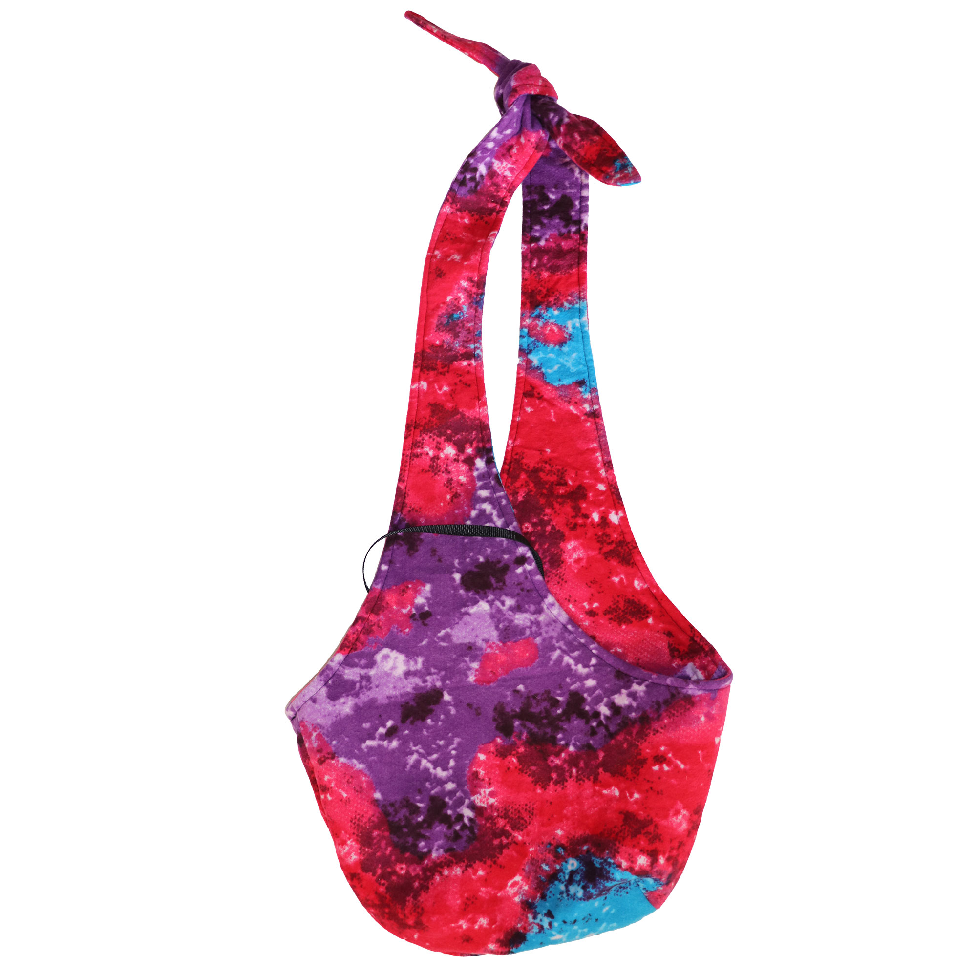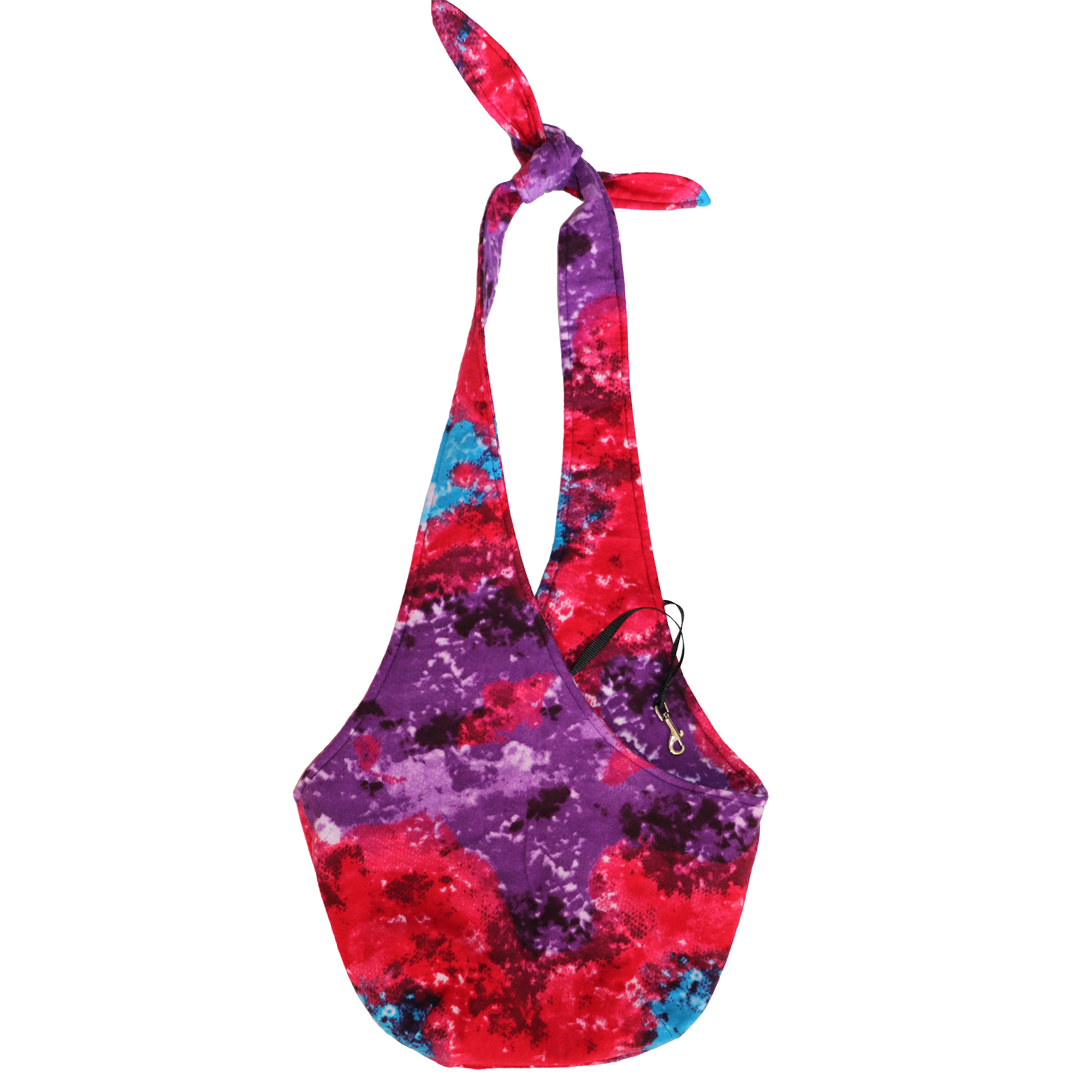 Tie Dye Pet Sling Carrier for pets up to 10 pounds. Made from pre-shrunk 100% cotton flannel fabric inside and out with fusible fleece for added comfort and strength. Features a removable safety strap to attach to your pet’s collar or harness. Top stitched for a finished look. Straps tie at the shoulder and are adjustable for length.